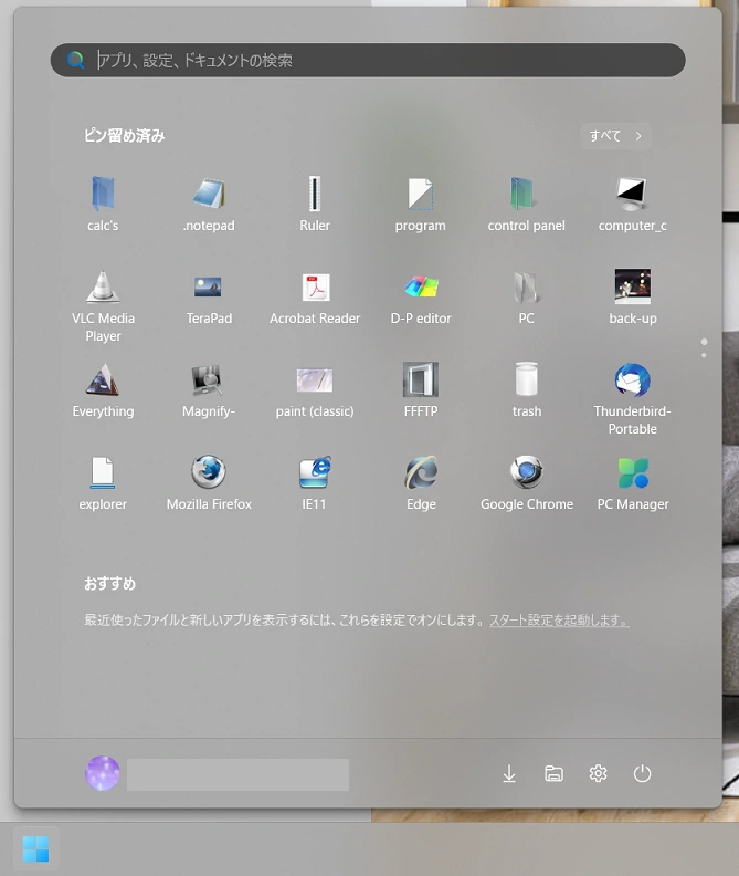 因みに、Windows11旧スタートメニューのデフォルトは、「ピン留めされたアイコンの集まり」と「おすすめメニュー」とで構成されています。*