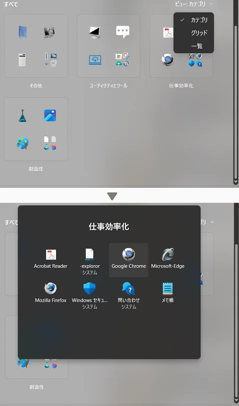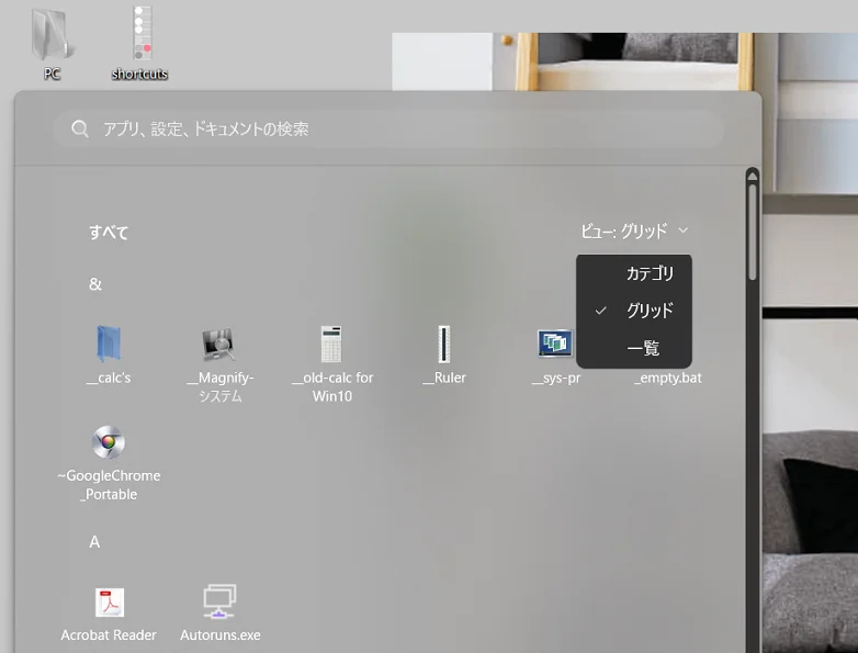 なお、"すべて"の「グリッド」「一覧」の並び順を変える方法・未登録のファイルやフォルダを"すべて"に載せる方法は、旧スタートメニューに引き続き、(当サイトの)系列の別サイトWindows10 Screen Customize Tipsで解説している方法と同じ(=Windows10と同じ)になります)